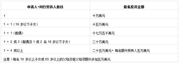 注:1、除了以上投资金额外,主申请人还须支付七千五百美元作为背景审查的费用。如同行的受养人年满12 岁,亦须支付有关费用。配偶的背景审查费用与主申请人相同,12 至16 岁受养人的背景审查费用为二千美元,16 至25 岁或65 岁以上受养人的背景审查费用为四千美元。
