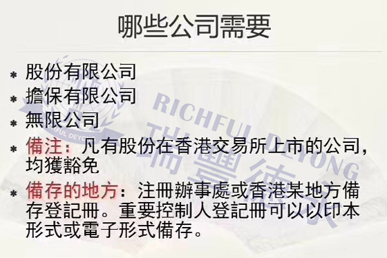 具体规定:所有在香港成立的公司都需要对重要控制人进行登记在册,登记在册事项内容必须建册并存于注册办理处地址或者香港指定地址,政府执法人员将随时进行查阅。