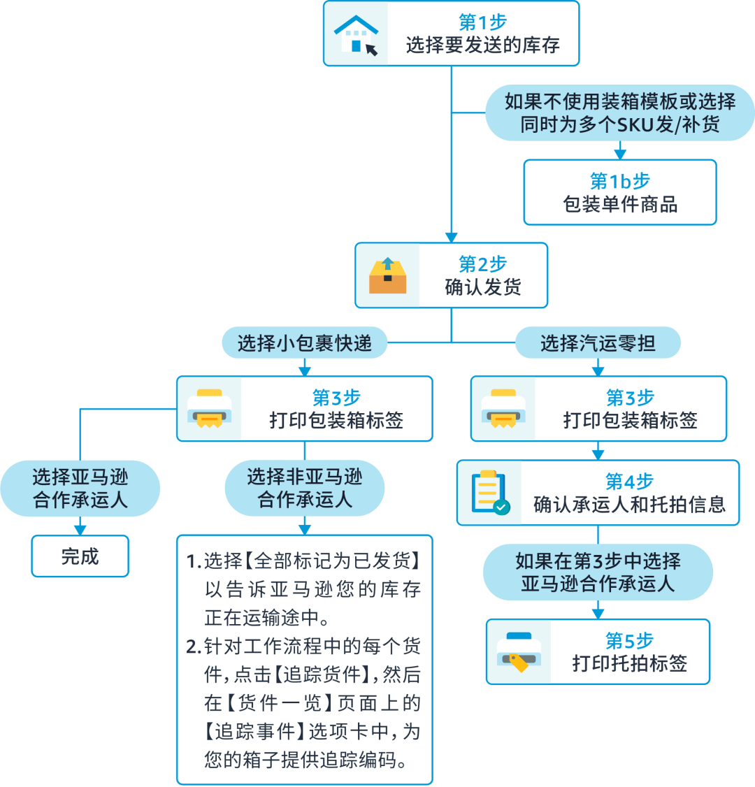 根据所在的站点及创建货件时所做的选择,卖家看到的步骤可能有所不同,大致步骤如下: