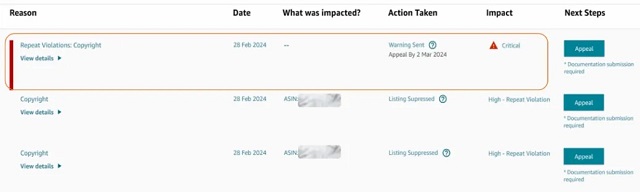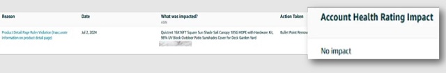 • 每次违反同一政策,您的账户状况评级中与该违反政策行为相关的分值都会增加。这意味着,反复违规会导致您的账户状况评级更快地被降级,反复出现严重程度更高的违反政策行为影响更大。为了帮助您识别和跟踪重复违规行为,以更快、更系统地解决问题,重复违规行为会在您的账户状况页面的“影响”栏中被标记。
