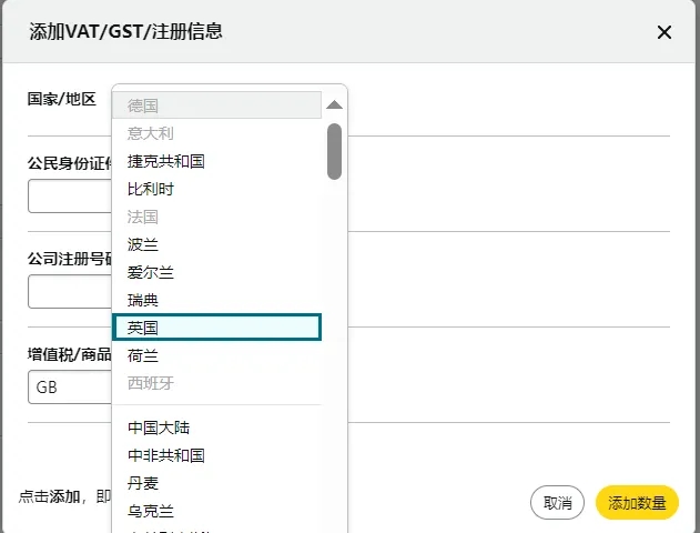 注意:在某些国家/地区,可能需要向税务机构注册纳税人识别号(TIN)才能获取增值税登记号。